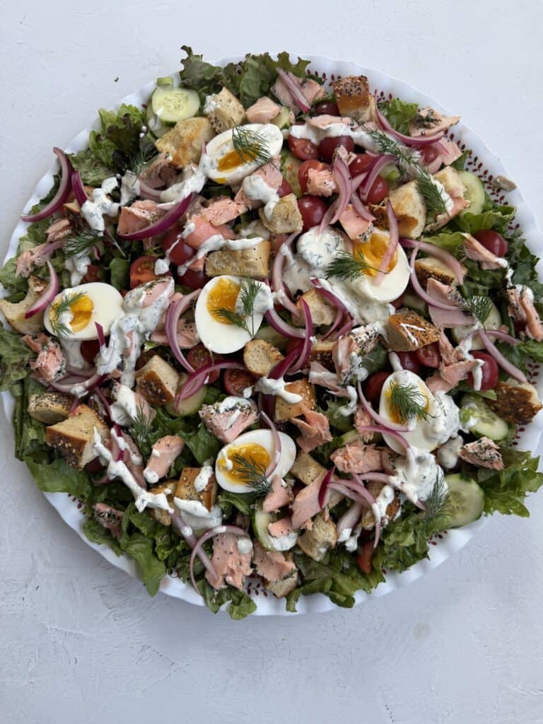 - Add all the remaining ingredients to a large shallow bowl. Top with the croutons, flaked salmon, cream cheese dressing, and garnish with extra dill fronds.