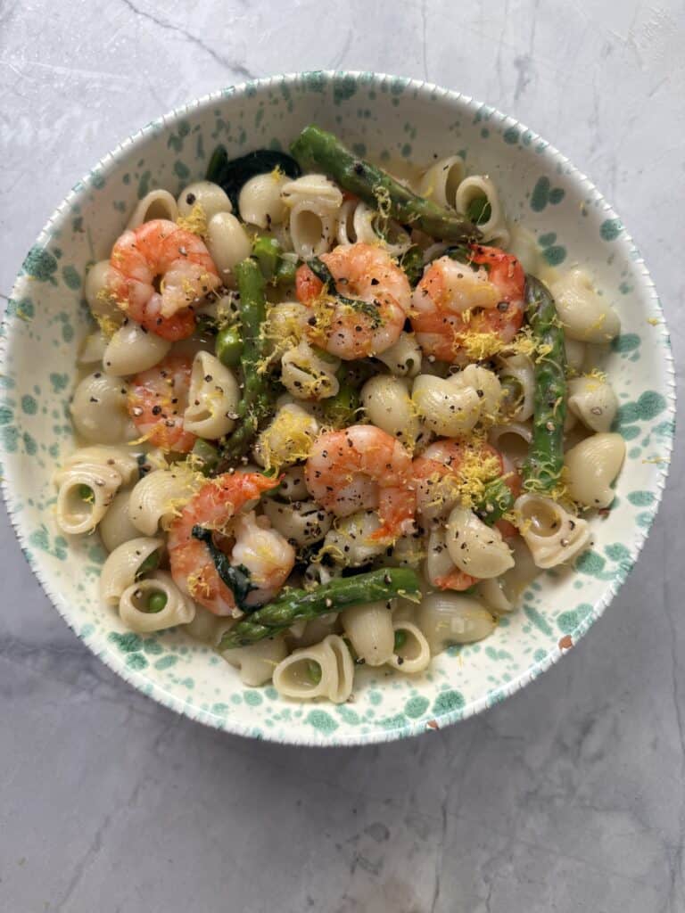 This is one of my favorite 30 minute meals when I want something that feels bright and balanced but still comforting. You get juicy shrimp, tender pasta, and a whole garden of green vegetables all cooked together in one pan. It is packed with protein, full of spring vegetables, and honestly just a really satisfying way to get dinner on the table fast.